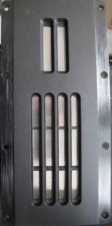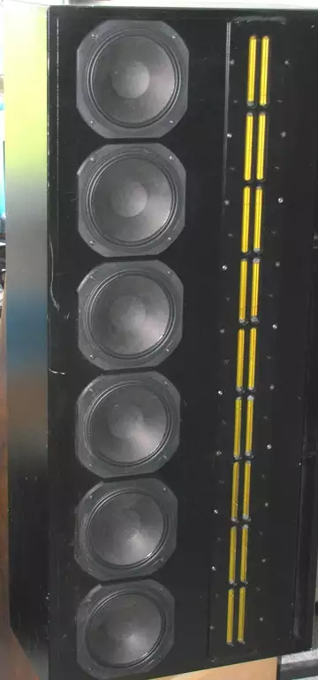 Rechts ein Beispiel der Kombination der 108er Antriebseinheit als Mitteltöner mit der 110er Einheit als Hochtöner in einer gemeinsamen flachen Alufront. Hier zudem mit gewendeten Membranfolien (Alu-Leiterbahnen nach vorn), was bei manchen Modellen möglich ist. Von manchen Kunden aus optischen Gründen präferiert.